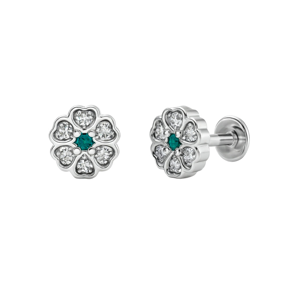 925 Sterling Silver Green CZ Floral Stud Earrings with Heart-Shaped Halo