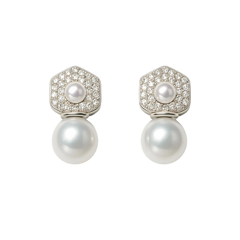 925 Sterling Silver Hexagon Pearl Drop Earrings with CZ Pave for Women