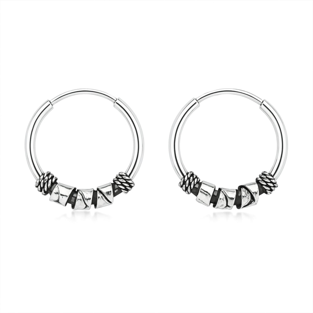 925 Sterling Silver Men’s Bali Hoop Earrings – Oxidized Tribal Beaded Design