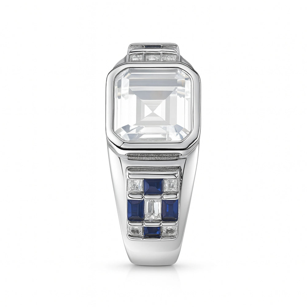 925 Sterling Silver Men’s Ring with Blue Sapphire-Style CZ & Baguette Stones