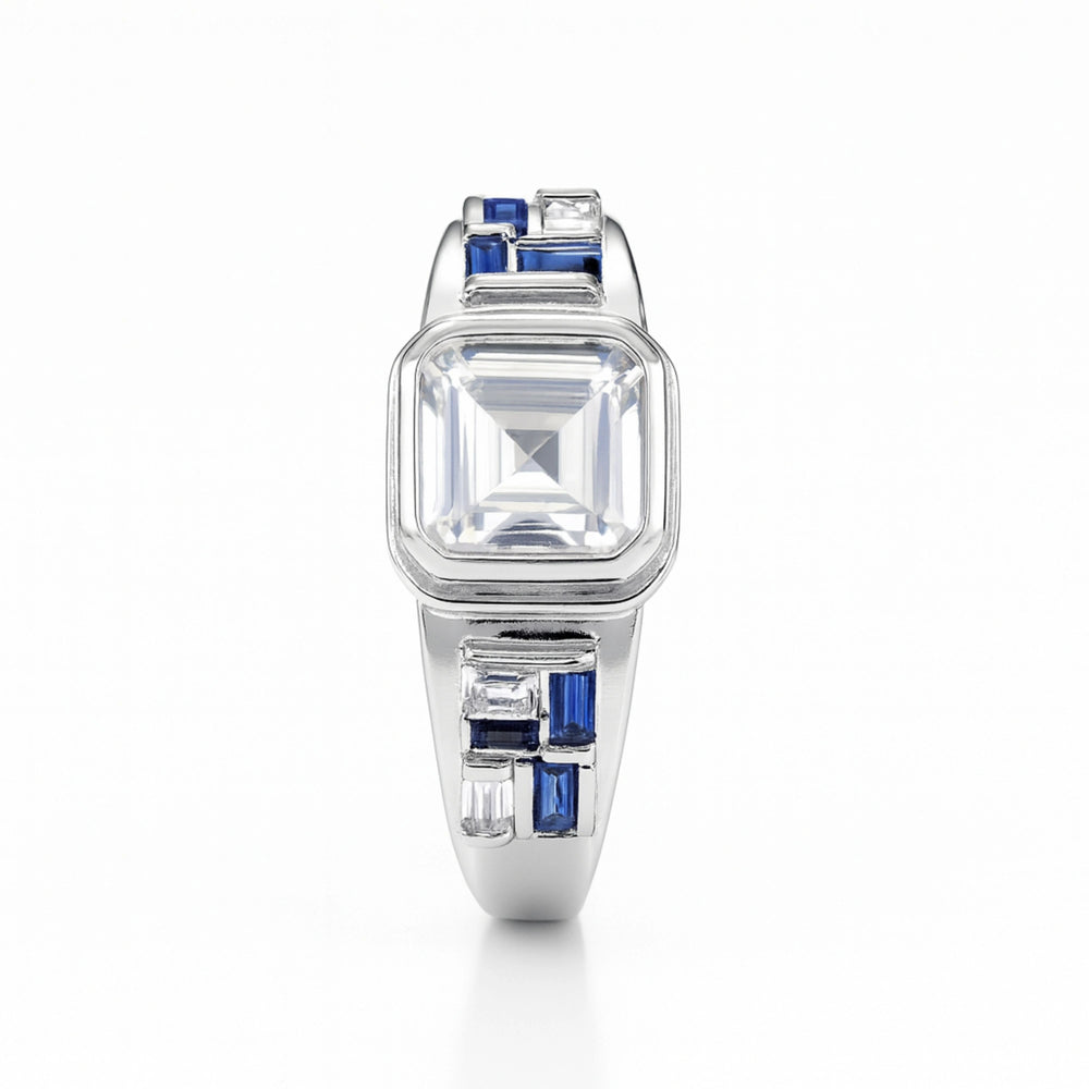 925 Sterling Silver Men’s Ring with Sapphire-Style Blue CZ & Baguette Stones
