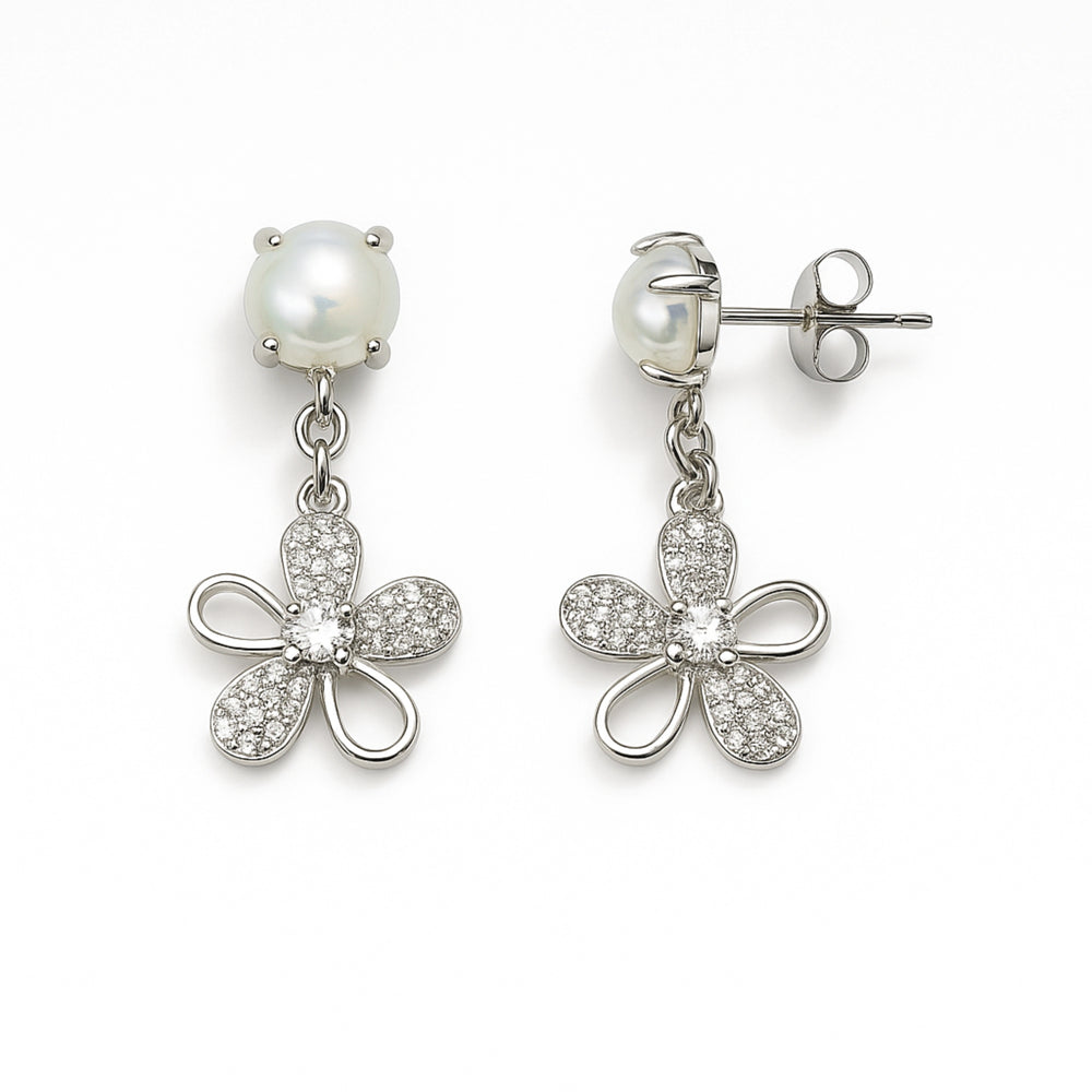 925 Sterling Silver Pearl Flower Drop Earrings | CZ Floral Dangle Design for Women