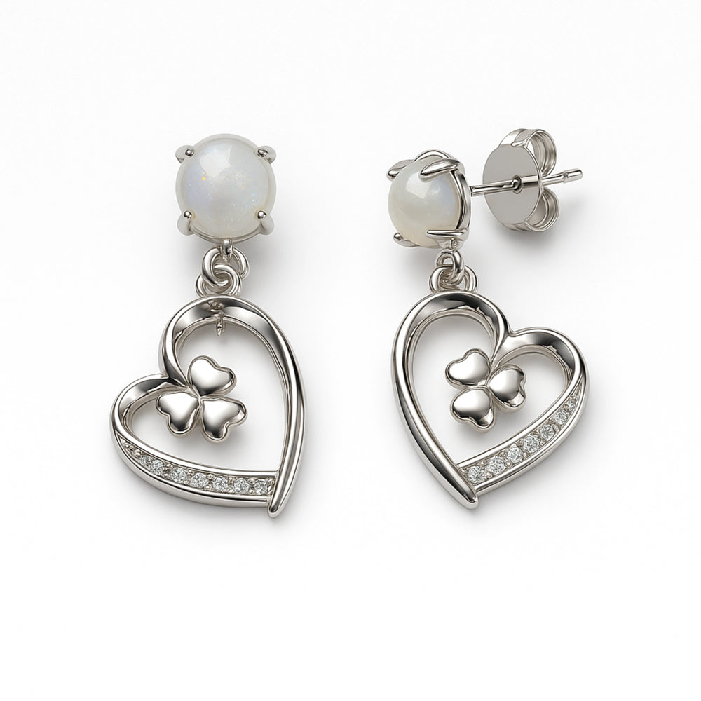 925 Sterling Silver Pearl Heart Drop Earrings | CZ Accented Heart & Clover Dangle Design