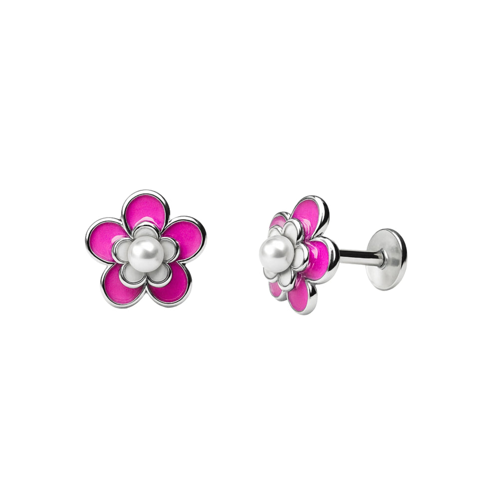 Magenta Five-Petal Pearl Stud Earrings