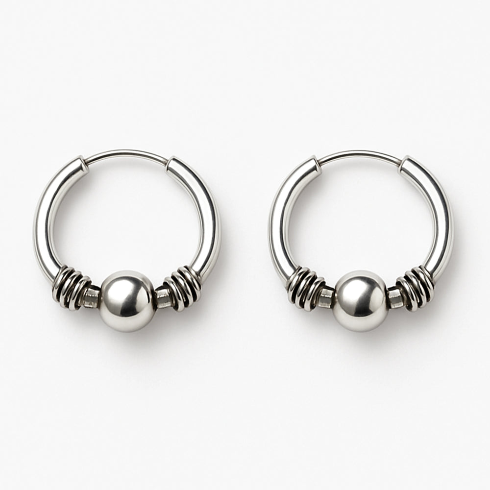 Men’s 925 Silver Bali Earrings – Clean Round Bead Hoop with Triple Ring Detailing