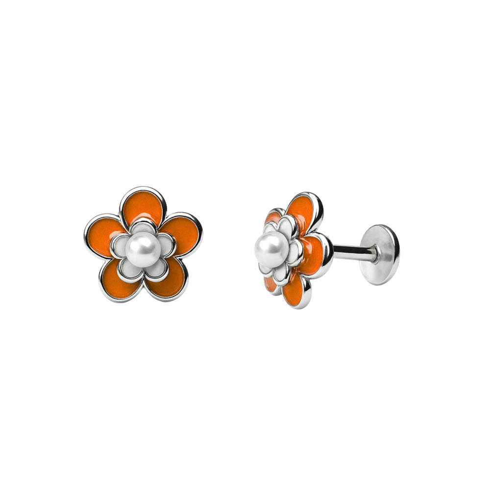 Orange Enamel Floral Pearl Stud Earrings