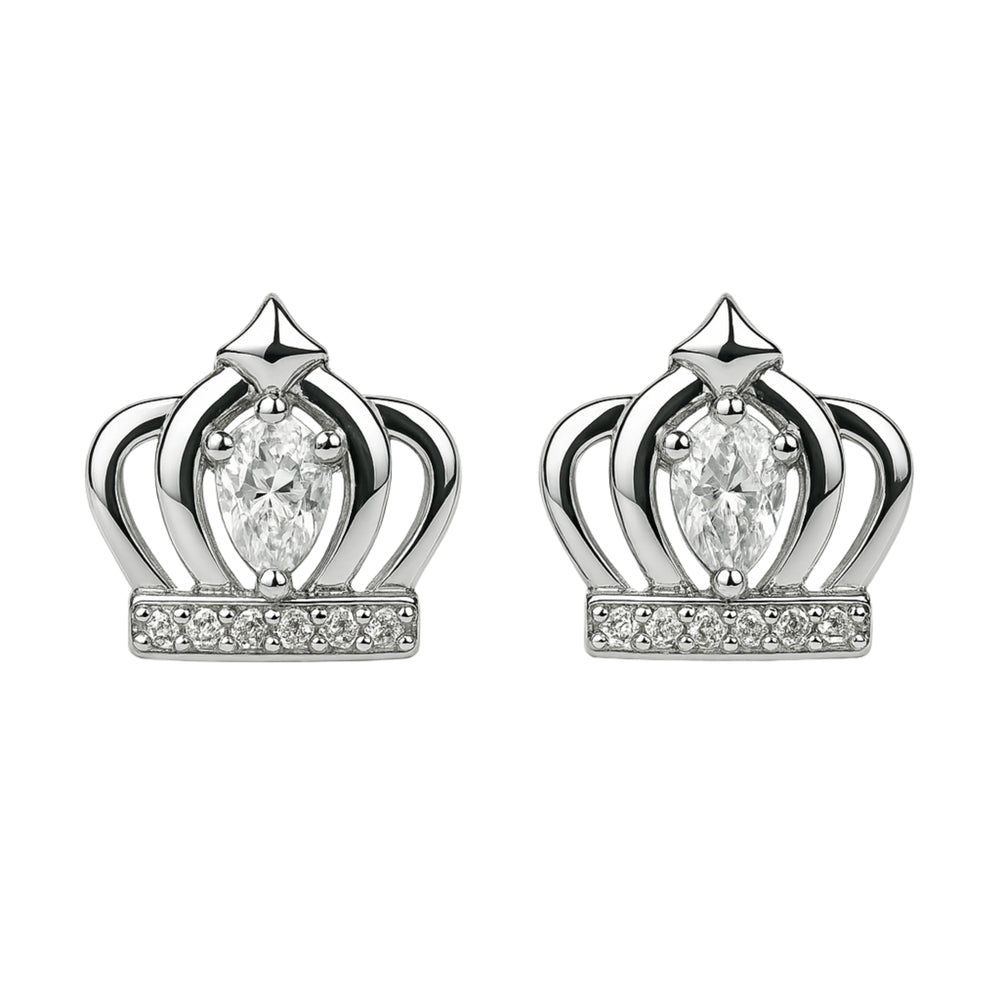 Silver Crown-Shaped Stud Earrings with Pear-Cut Solitaire & CZ Accents