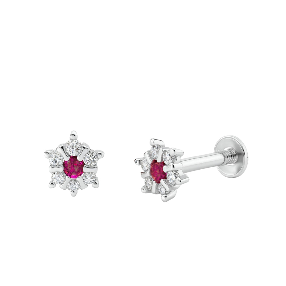 Silver Flower Stud Earrings with Ruby Center Stone