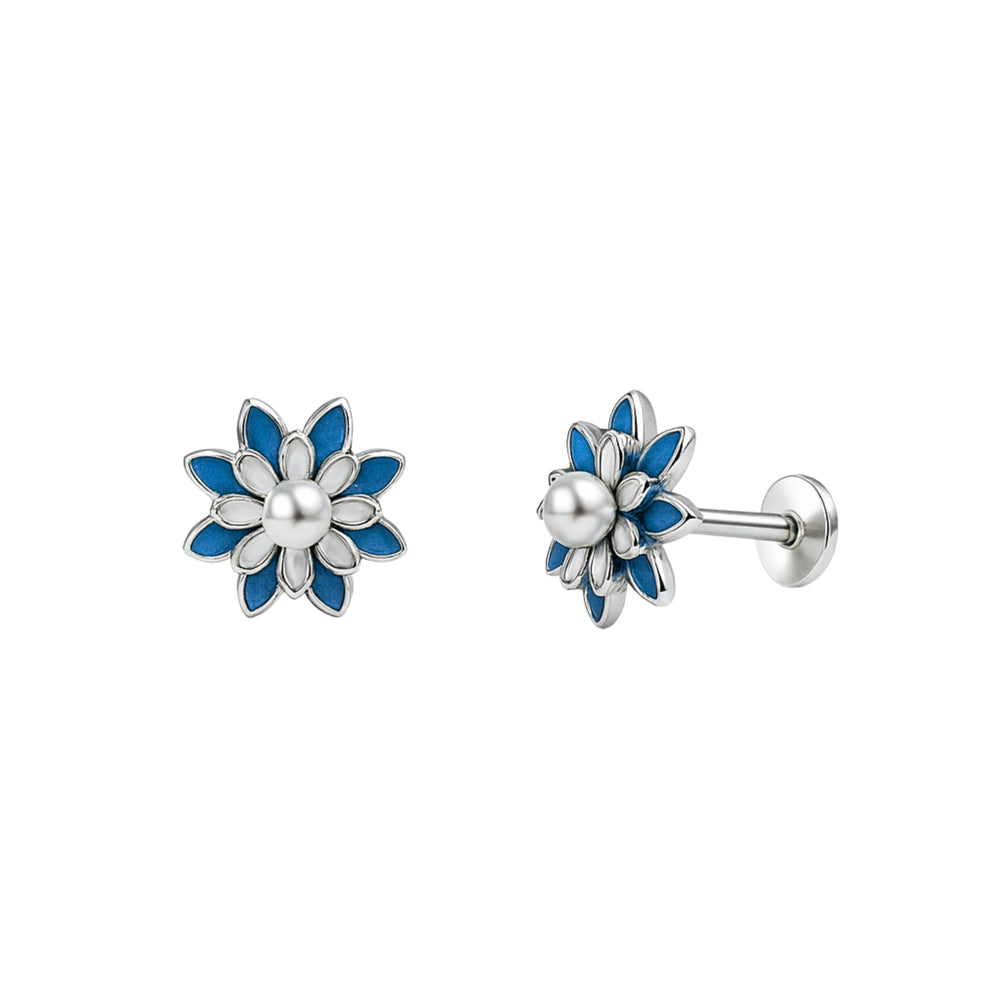 Silver Pearl Blue Enamel Flower Stud Earrings
