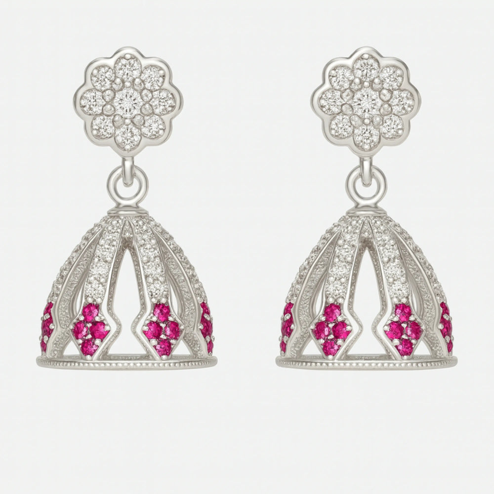 Sterling Silver Floral Top Jhumka Earrings with White and Pink Stones