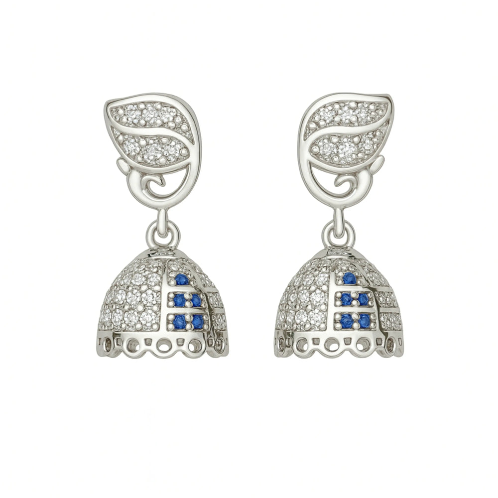 Sterling Silver Leaf Top Jhumka Earrings with White and Blue Stones