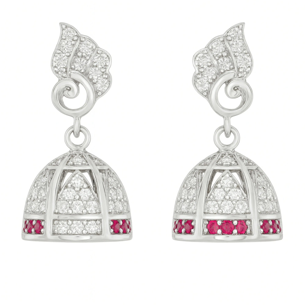 Sterling Silver Leaf Top Jhumka Earrings with White and Red Stones