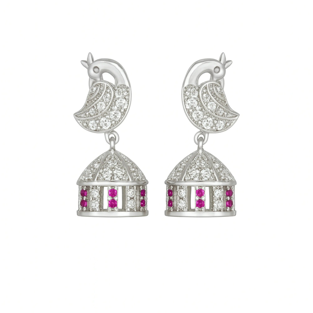 Sterling Silver Peacock Top Jhumka Earrings with White and Pink Stones