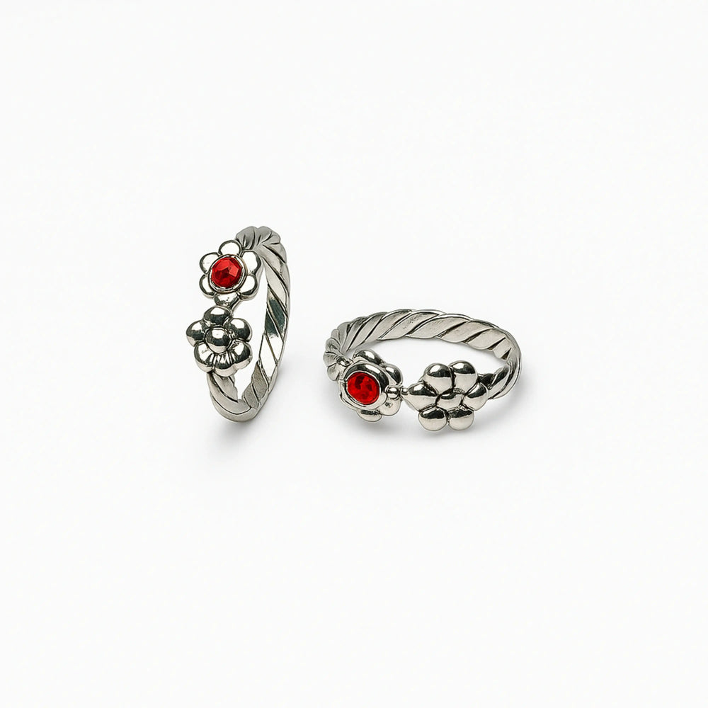 Sterling Silver Twisted Band Flower Toe Ring with Red Stone