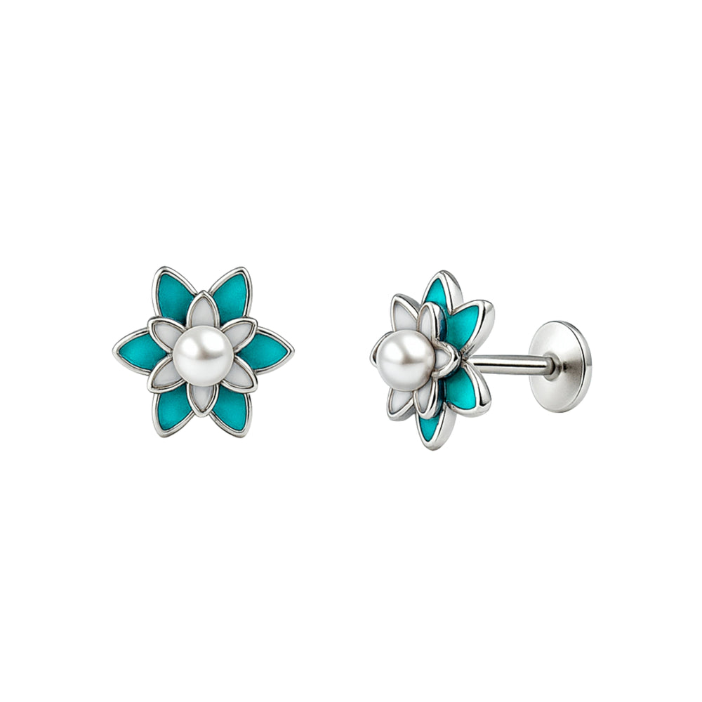 Teal Enamel Floral Pearl Stud Earrings